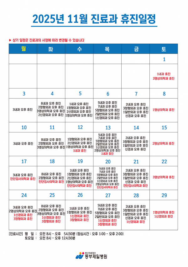★[2025년 11월 진료과 휴진일정] 페이지 정보 작성자 동부제일병원 작성일 25-10-28 15:26 조회 214회 댓글 0건 관련링크 본문 상기 일정은 추후 각 과의 사정에 따라 갑자기 변경 될 수 있사오니 양해 부탁 드립니다 댓글목록 등록된 댓글이 없습니다. 목록