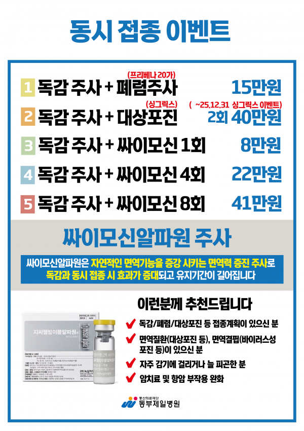 [이벤트] 50세이상 4가지 필수 예방접종 + 독감주사 동시접종 이벤트 페이지 정보 작성자 동부제일병원 작성일 24-10-23 12:32 조회 2,284회 댓글 0건 관련링크 본문 50세이상 4가지 필수 예방접종 안내 댓글목록 등록된 댓글이 없습니다. 목록