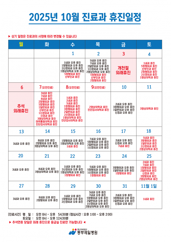 ★[2025년 10월 진료과 휴진일정]